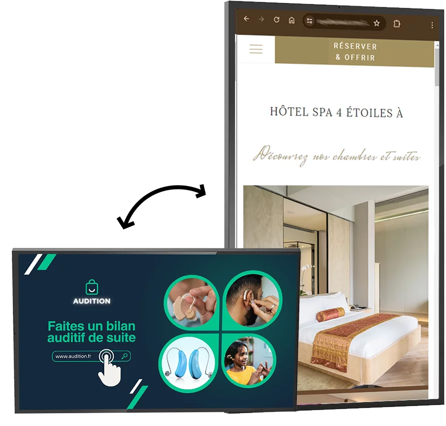 Installables en orientation portrait ou paysage, ils s’adaptent naturellement à vos contraintes d’espace et à votre identité visuelle.